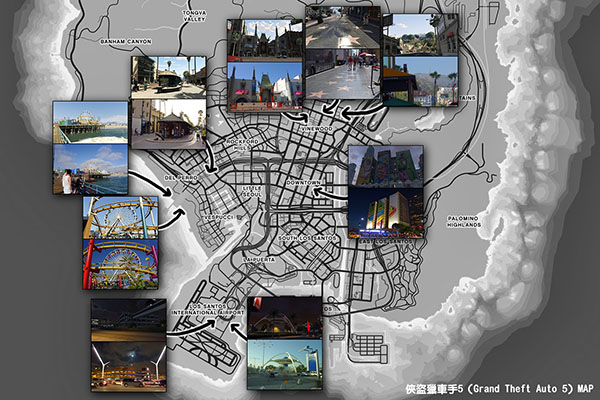 主要設定在虛構的聖安地列斯州,這是對南加州的諷刺性描繪。遊戲世界包含各種城市、城鎮、鄉村地區和地標。以下是GTA 5地圖中的一些重要地點: