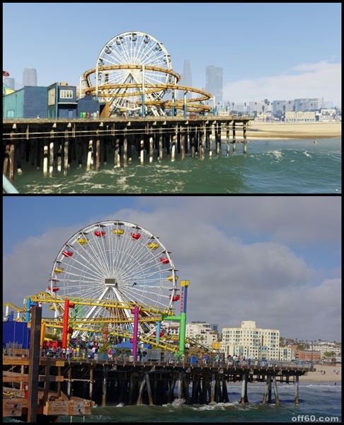 聖塔莫尼卡遊樂園最明顯的摩天輪跟雲霄飛車,這時候就不得不佩服GTA5的製作小組,真的幾乎做出一模一樣的場景。